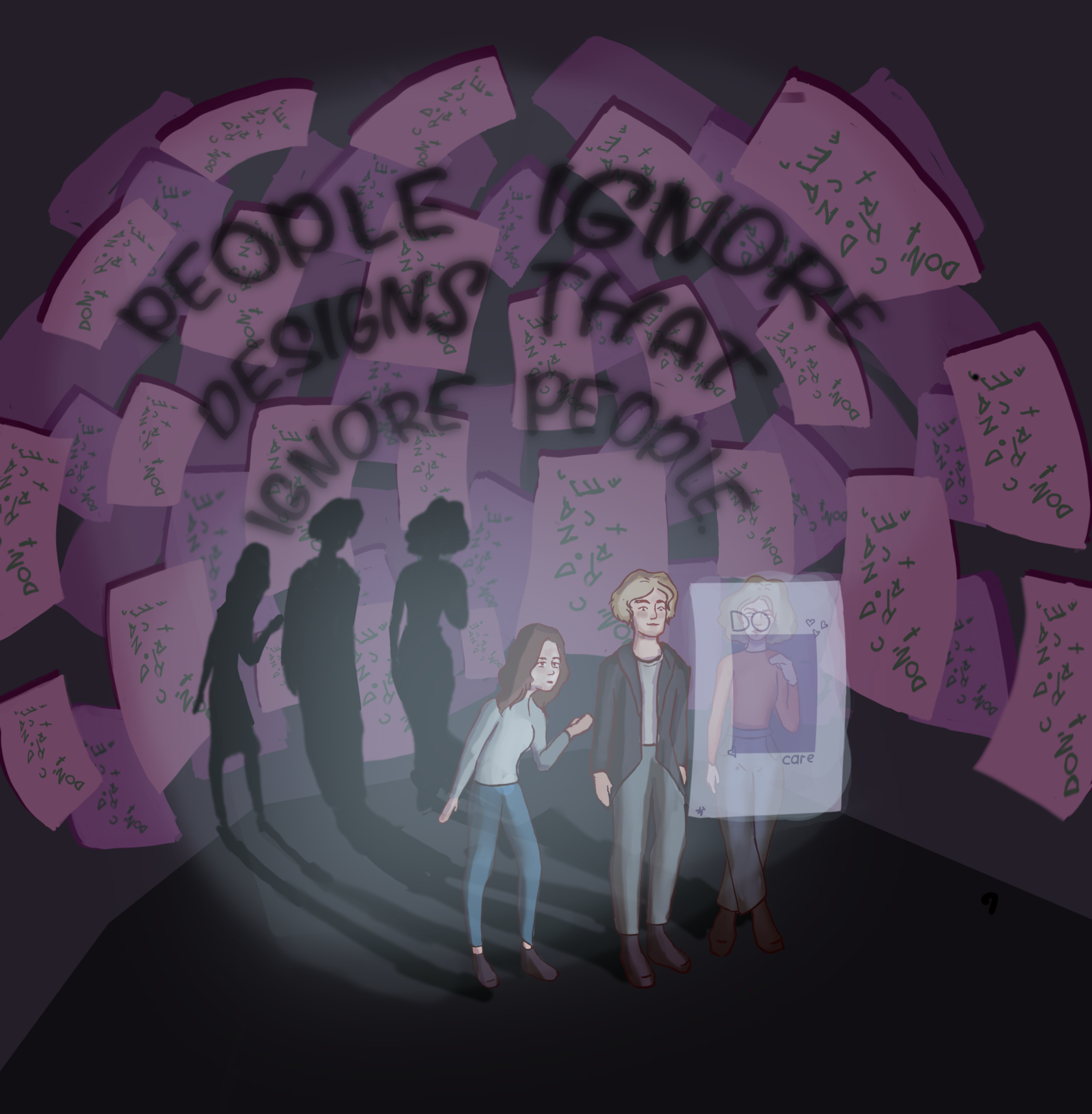 An illustrative poster depicting the quote "people ignore designs that ignore people". The background shows exactly those designs that are made without taking into account the target audience, and the poster in front is the opposite.