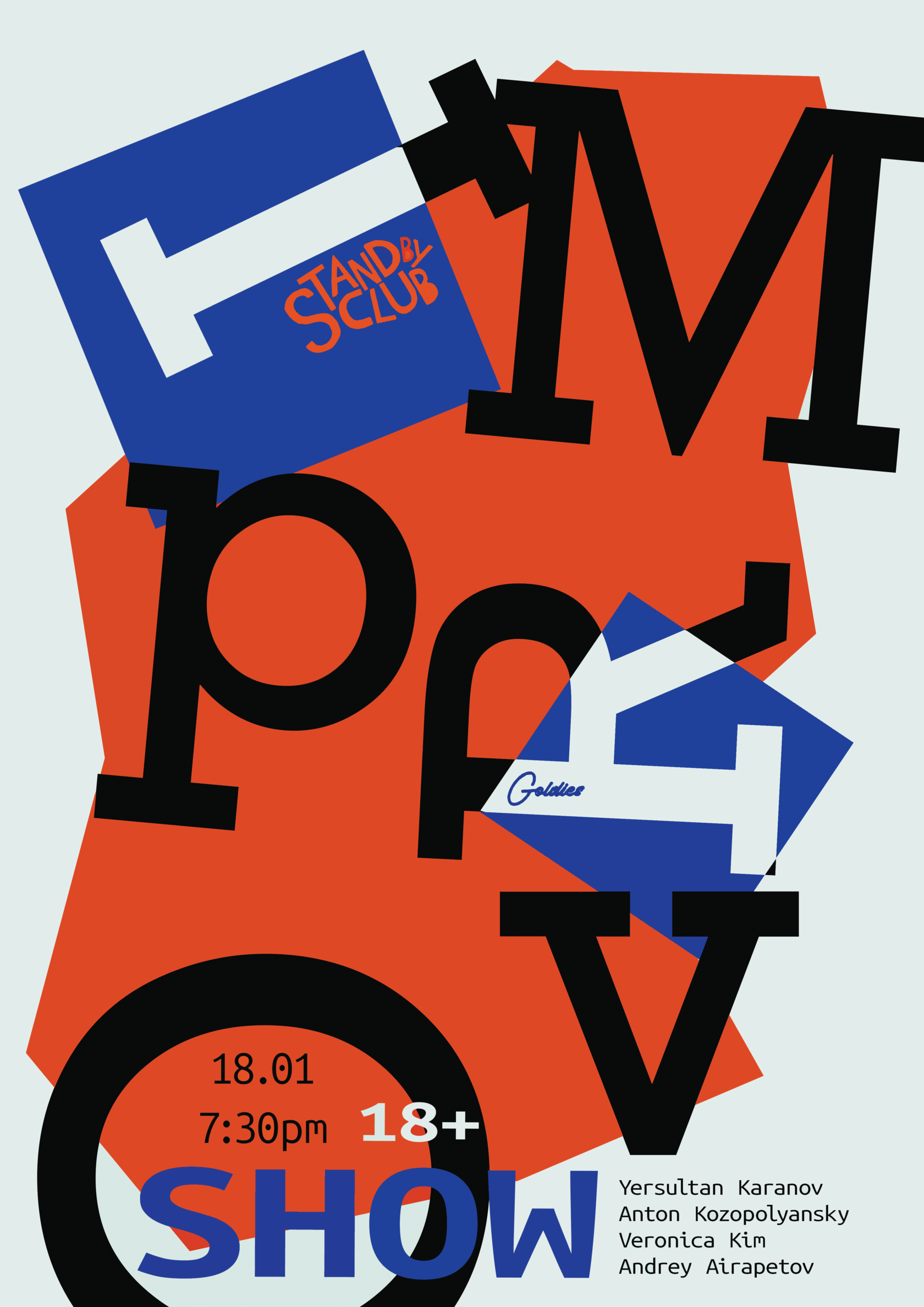 This poster was created for a stand-up show called "IMPROV", the necessary information was used (participants, date, time, age limit), and sponsors are indicated. The poster was created for personal practice purposes and not used by the company.